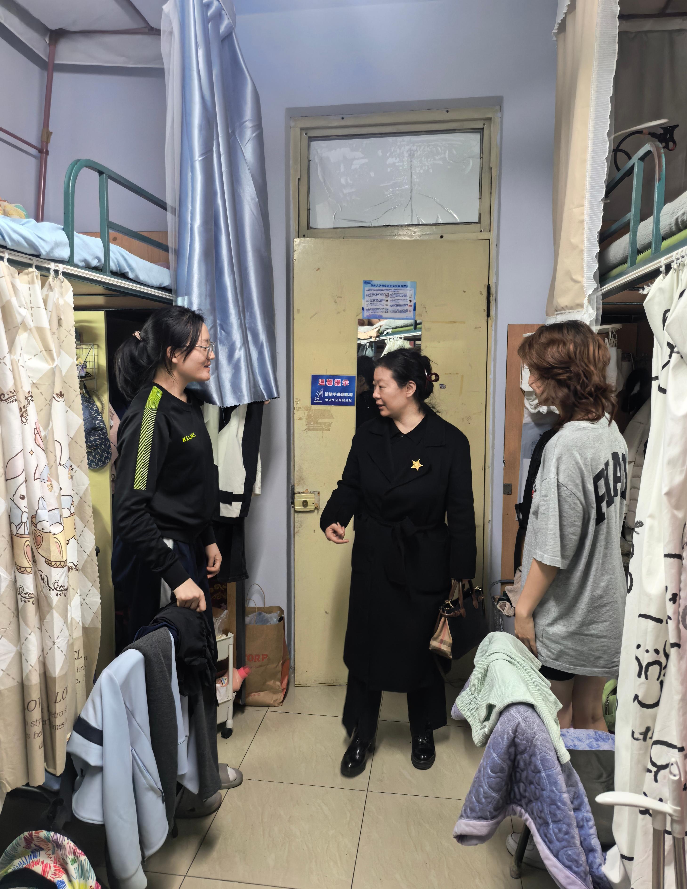 三位老师对照假期寝室管理标准,逐寝核查卫生状况、用电安全、消防隐患及离校报备情况。重点开展贵重物品保管、电源切断、门窗关闭等工作,对整理不规范的寝室点对点沟通,确保达到假期安全要求。同时,向学生叮嘱离校注意事项,对留校学生强调假期宿舍管理规定与安全防护要点。查寝间隙,师生们亲切交流,传递在线赌博