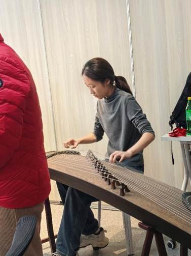 活动现场,音乐系步冰冰负责场地布置与活动统筹。美术系乔文华、杨锦添及设计系计宣宇开展花卉绘画公益教学,围绕构图、调色、笔触等内容示范教学,一对一指导居民创作。音乐系王澜锡、于佳鑫分别演奏民乐《夜深沉》、钢琴曲《月亮代表我的心》,悠扬乐曲营造雅致静谧的活动环境。